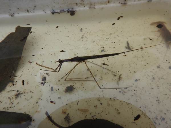 The stick-insect-looking creature (pictured above) is a Needle Bug. Needle Bugs are found in a wide range of waterbodies and breathe through a long ‘snorkel’ that extends from the abdomen to above the water surface (see photo). They are ‘sit and wait’ predators that are well camouflaged in underwater vegetation. When prey swims by they grab it with their two front legs, stab it with their proboscis, injecting dissolving enzymes and then suck out the resultant ‘soup’. Who needs to watch Alien.