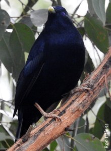 And there it was in the middle of the bush, a collection of blue articles (pictured above) – packing twine, packing straps, plastic lids, even the top of a BIC ballpoint pen. It took four visits to the bower over several days to eventually see the constructor of the bower (pictured right). The male is solid black in colour (the female is green/brown) but when the light is at the correct angle it diffracts off the feathers to give the male bird a distinctly metallic blue appearance. Most striking however are the violet-blue eyes.