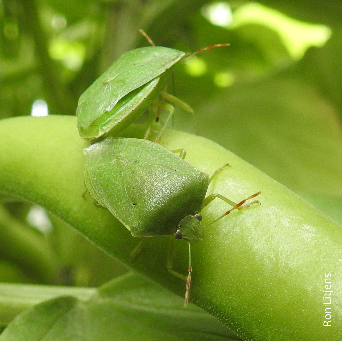 But just consider the plight of most insects. They have to do the deed al fresco which means they have to contend with the elements rain, hail or shine. In many cases insects can find a secluded spot away from prying eyes deep within the vegetation, for example this pair of Southern Green Stink Bugs (Nezara viridula) mating on a broad bean (pictured left).
