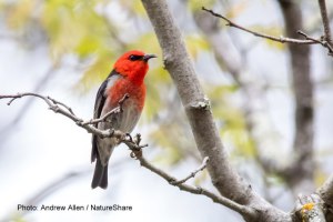 Usually confined in Victoria to Gippsland coastal areas in spring/summer, the Scarlet Honeyeater in some years can proliferate and spread far and wide, an event known as an irruption.
