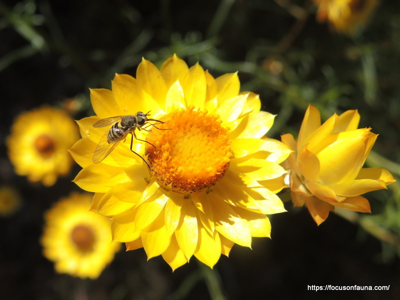 The Golden Head Rutilia Fly is primarily a nectar feeder, but was unfortunately not seen during our participation in the recent Wild Pollinator Count, a citizen science project which involves observing which insects visit a selected flower or group of flowers over a ten-minute period. What we did see is the native bee fly pictured at right (click on the photo for a closer look) which, with the help of Karen at the WPC, we think may be an Australiphthiria species. Bee flies (family Bombyliidae) are also nectar and pollen feeders and our example was seen on Sticky Everlasting, Xerochrysum viscosum. We tend to think of bees and perhaps wasps as the main plant pollinators, but flies also play a major role. In fact we’ve just learnt that flies won the most numbers in this spring’s Wild Pollinator Count!