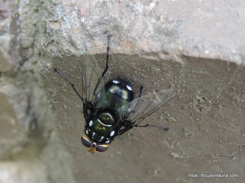 This rather large and strikingly-patterned fly was spotted resting on the brick wall of our house the other day. Thanks to fellow Focus on Fauna blogger Ronlit, we think it is a Golden Head Rutilia Fly, Rutilia argentifera. The species name argentifera would suggest silver, not gold, but perhaps it refers to the whitish/silver spots on the body, rather than the yellow head.