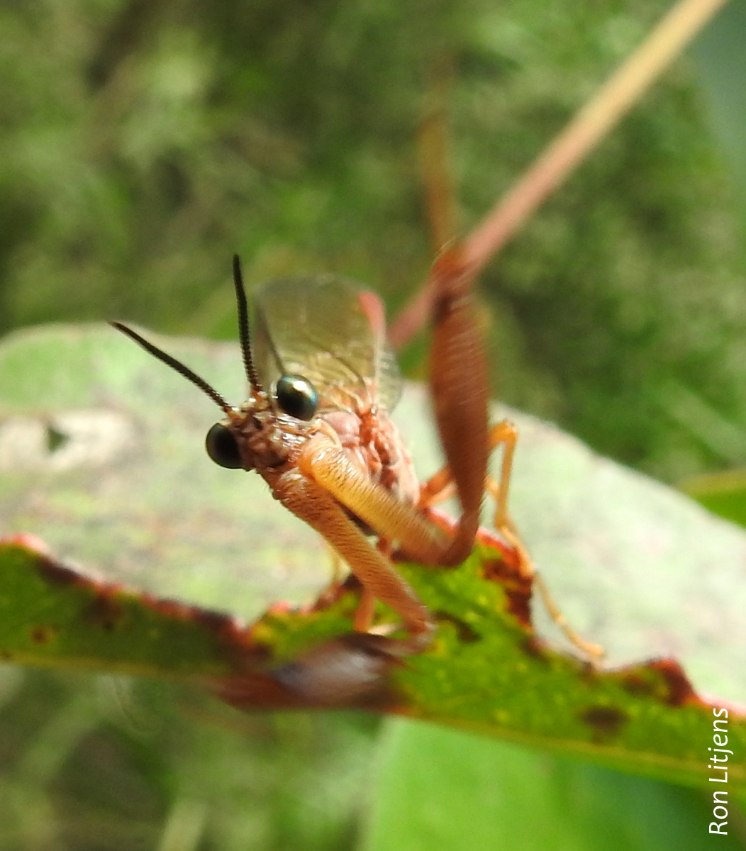 It was on one casual gum leaf observation trip I came across the insect pictured above. It is a Mantis Fly (order Neuroptera) but it is neither a mantis nor a fly. The Mantis Fly is a type of lacewing. The mantis reference pertains to the large raptorial forelegs which the mantis fly uses to grasp prey. They are most active at night and are active predators hunting sizable insects.