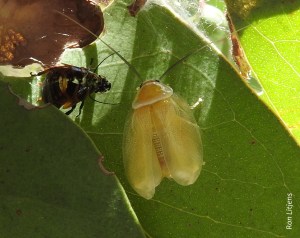 Spring and summer are when most insects hatch and grow. It is common at this time of the year to see the discarded insect skeletons hanging around, like abandoned onesies. The process of shedding the skin is called ecdysis. Seeing ecdysis in action though is not so common. One needs to look carefully through the vegetation.