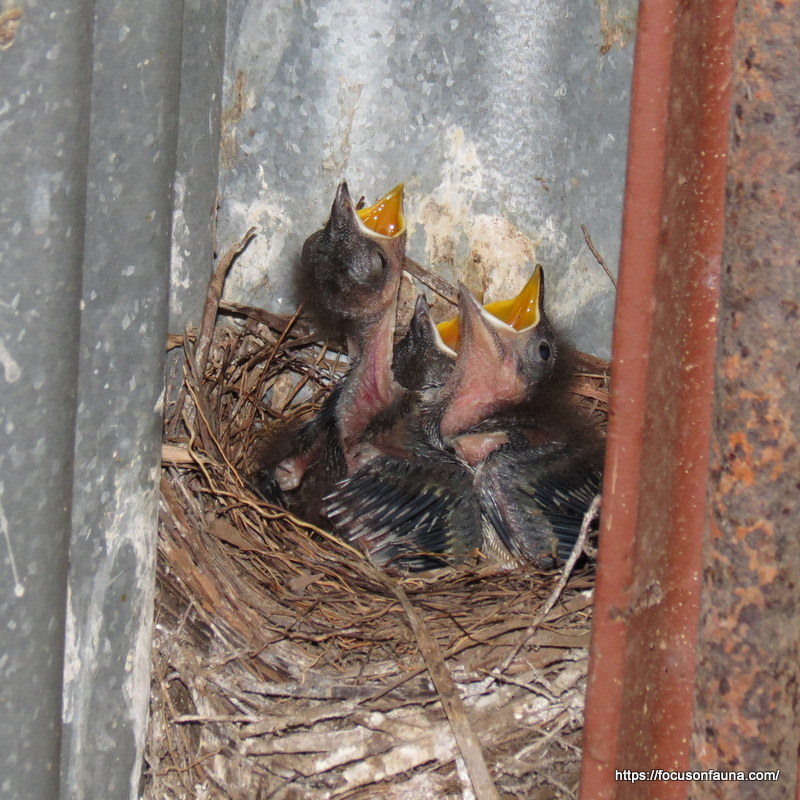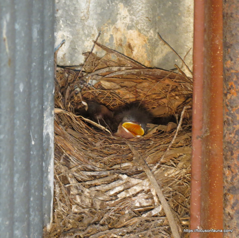 A few days later, and a noise made by us in the shed was often enough to trigger the gape response in the hungry chicks expecting a parental visit, as seen in the photo below, which clearly shows their yellow/orange gapes.