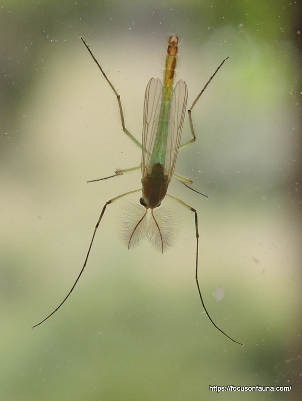 If so, it is a nectar feeder and potential pollinator, although not all adult midges actually feed. But with those feathery antennae (which indicate a male) plus a hairy abdomen and rear legs, it is easy to see it being an efficient pollen collector. Click on the image for a closer look.