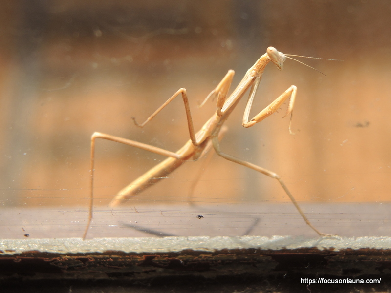 Another non-fly insect keen to have a peek through the door was this small frail mantis nymph at left, which was only about 4cm long.