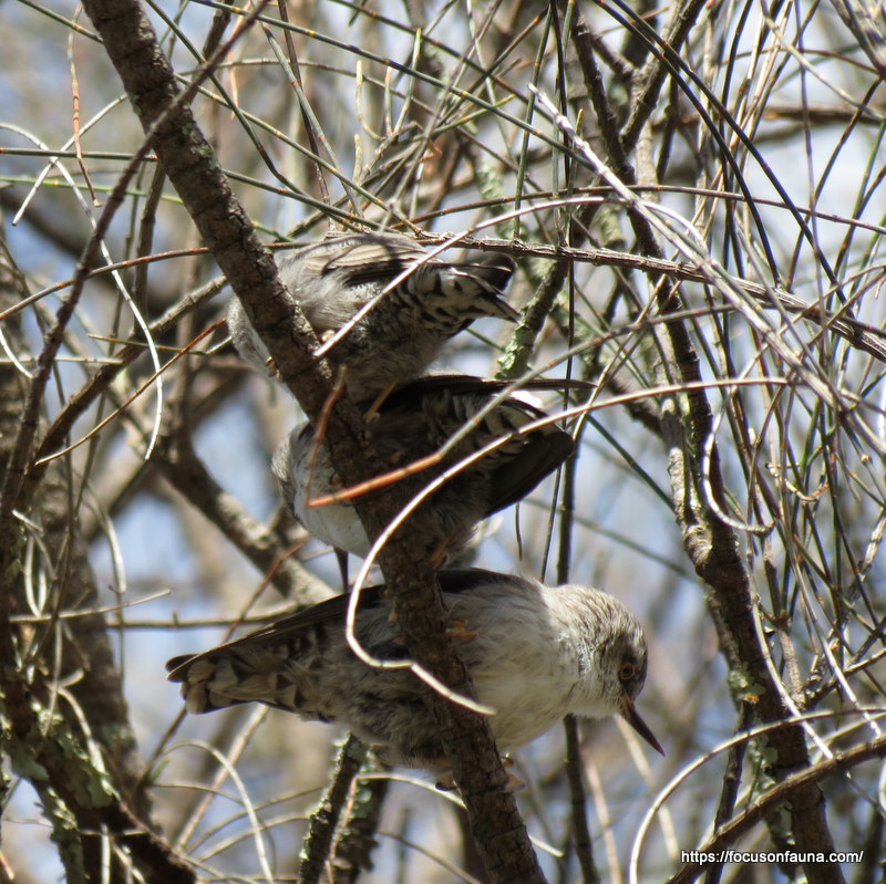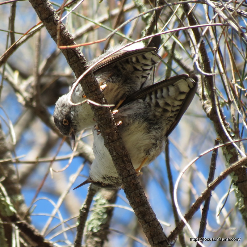 The other species that appeared the other day among a mixed flock of thornbills, Weebills and Grey Fantails, was a small group of Varied Sittellas which included a couple of juvenile birds (see left) that were still being fed by an adult. The sittellas are rather odd little birds, adept at busily foraging among tree branches and head-first down tree trunks. They have sharp slightly upturned bills ideal for prising out grubs, beetles, spiders etc. When feeding they seem to be perpetually on the move, but when they do rest, they often huddle together with a lot of jostling for best position.