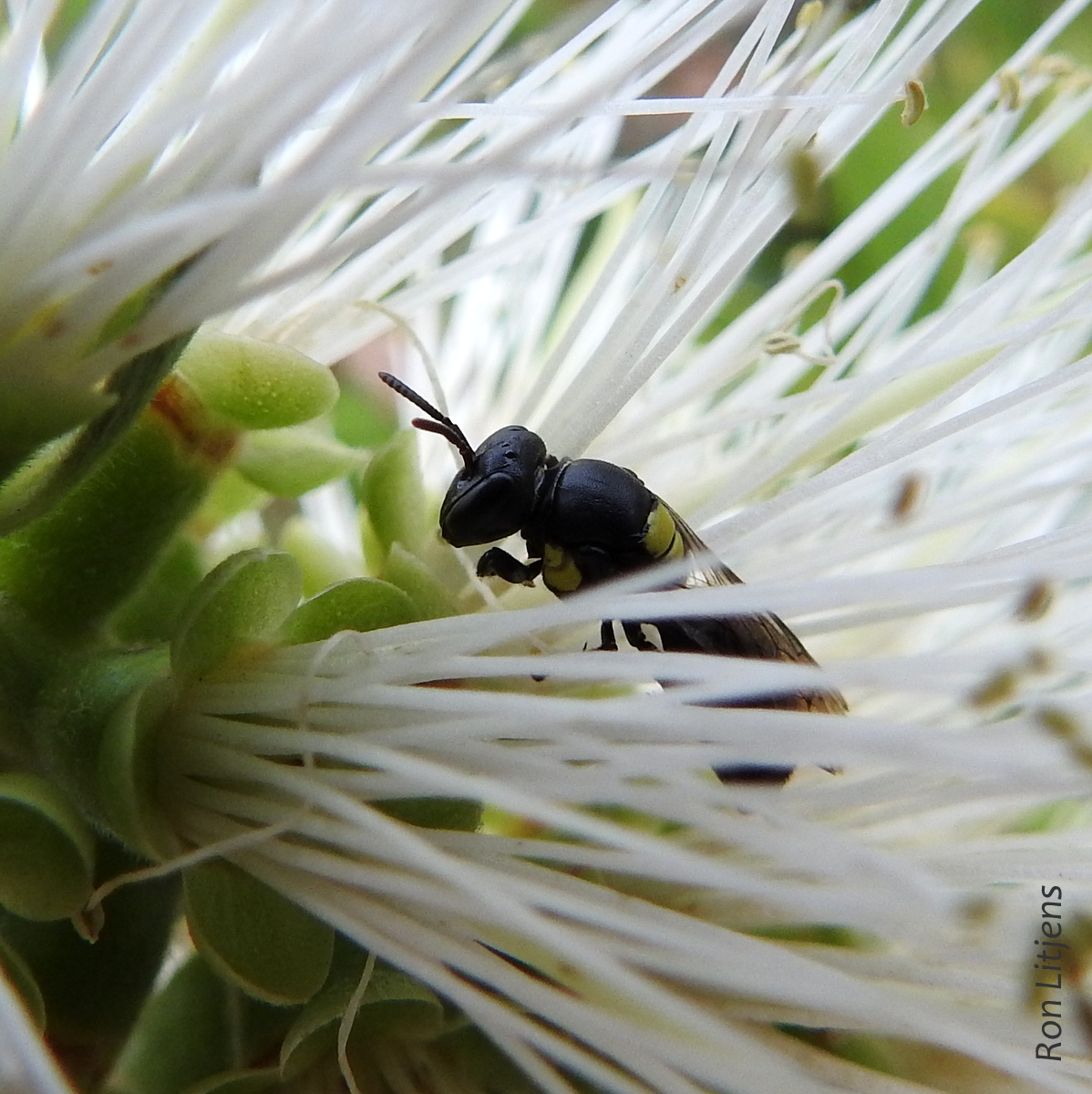 Wild Pollinator week got away from me. A tour of the local wetlands to celebrate the event yielded no flowers at all, such is the topsy-turvy nature of the seasons in the district at the moment. It was not until I was on a meditation retreat a week later that I had a chance to sit and observe the requisite flower for 10 minutes (how meditative is that!). The flowers were attracting a heap of native bees (see photographs) and though not in the King Parrot Creek valley, all of the bees pictured can be found there.