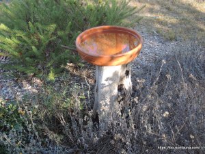 One of our many bird baths in the garden sits on a rotting stump – a remnant of a former Silky Oak tree, Grevillea robusta. We try to clean and refill the bath (pictured below) on a regular basis, and removing it for cleaning has lately revealed that the hollow centre of the stump is providing a great resting spot during the day for what looks like a little Lesser Long-eared Bat, Nyctophilus geoffroyi.