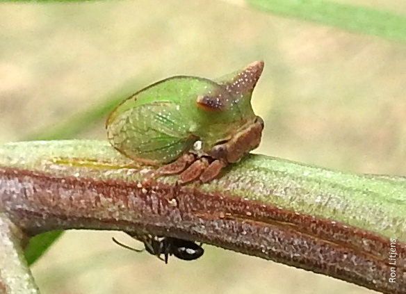 For treehoppers of the Membracidae family the pronotum is even more impressive. The Acacia Horned Treehopper (Sextius virescens), pictured below, is an example.