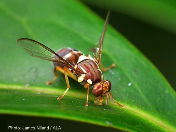 This rather attractive little fly may or may not be in the Flowerdale/Strath Creek area. It’s the Queensland Fruit Fly (QFF), Bactrocera tryoni, a native insect distributed through much of eastern Australia, and with a bad reputation as a pest of orchards and vegetable crops, both on a commercial scale and in home gardens. So it’s not just introduced species that can cause problems for agricultural activities. This is the annoying culprit that is responsible for you having to wastefully dump your fresh fruit before entering the Sunraysia Pest Free Area.
