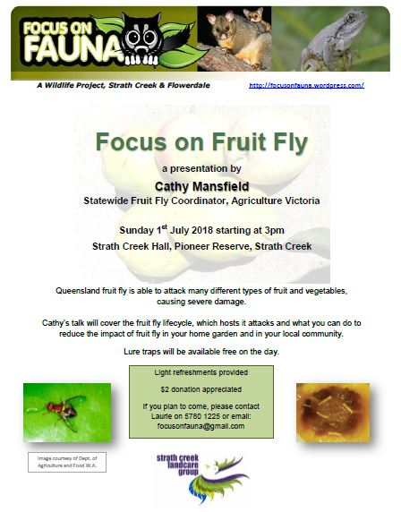 Next Sunday, 1st July, the Strath Creek Landcare group is hosting a Focus on Fauna presentation on the QFF by Cathy Mansfield, Statewide Fruit Fly Coordinator for Agriculture Victoria. Cathy will talk about the life cycle, host plants, damage caused and methods of control. All are welcome, but please email focusonfauna@gmail.com if you plan to come.