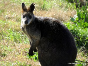 Wallabies in the bush are usually quite shy, bounding off noisily when confronted, and it is odd that some local wallabies seem oblivious to human proximity. Perhaps familiarity with cars breeds contempt. This particular wallaby did eventually hop off to the “cover” of long grass, but still seemed content to have its photo taken.