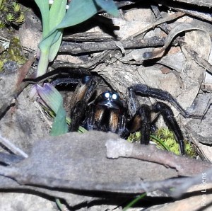 But what stunned me the most walking back to the house was the hundreds of reflected points of light as I passed by the cutting on the drive. Closer examination showed that the rock wall was riddled with tiny holes not obvious during the day. Sitting in these holes were Wolf Spiders (family Lycosidae). I don’t know if their eye-shine is from the same mechanism but once I got my eye in these spiders were everywhere on the ground through the bush, even floating on the surface of the dam.