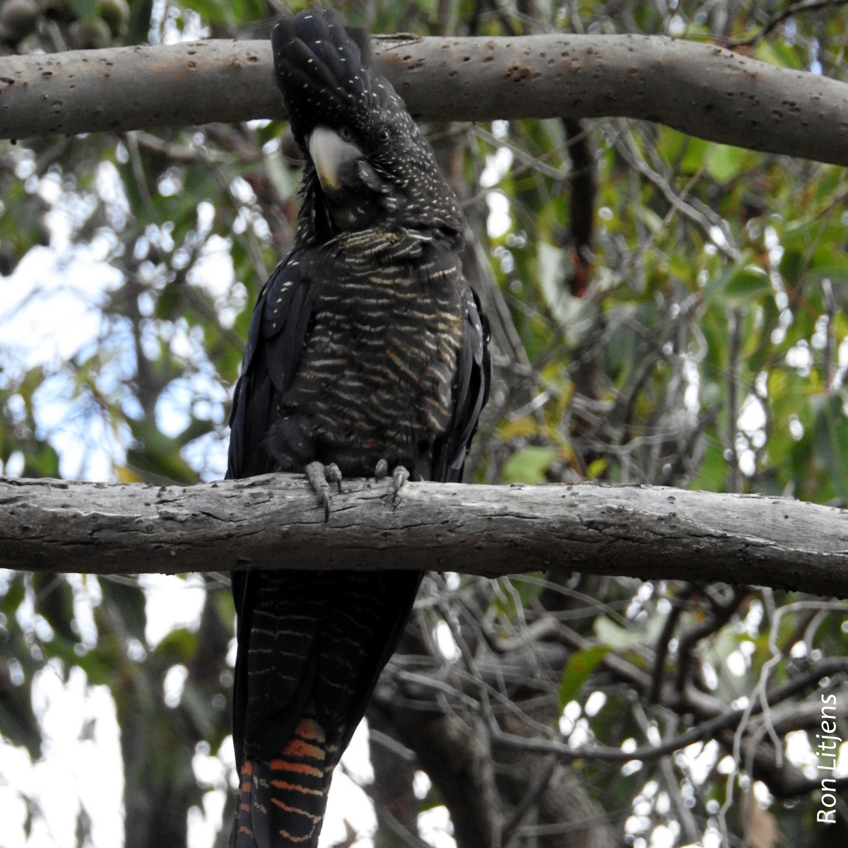 The Black-Cockatoos, of which there are five species, make up the genus Calyptorhynchus, the scientific name being derived from the Greek kalupto meaning ‘covered’ and rhunkhos meaning ‘bill’, i.e. covered bill. It refers not to the crest but the feathers which hide the lower part of the bill.