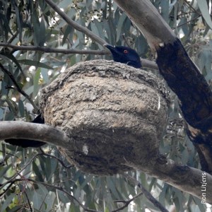An expedition with Sue to locate a White-faced Heron’s nest in the Strath Creek Pioneer Reserve yielded nothing, but on the way back we observed what looked like a mud nest of a White-winged Chough (Corcorax melanorhamphos) high up in one of the eucalypts. From our limited vantage point it was difficult to tell if it was from a previous season or this one. This week the tell-tale head of an adult looking over the nest rim (see picture left) confirmed an active nest site.