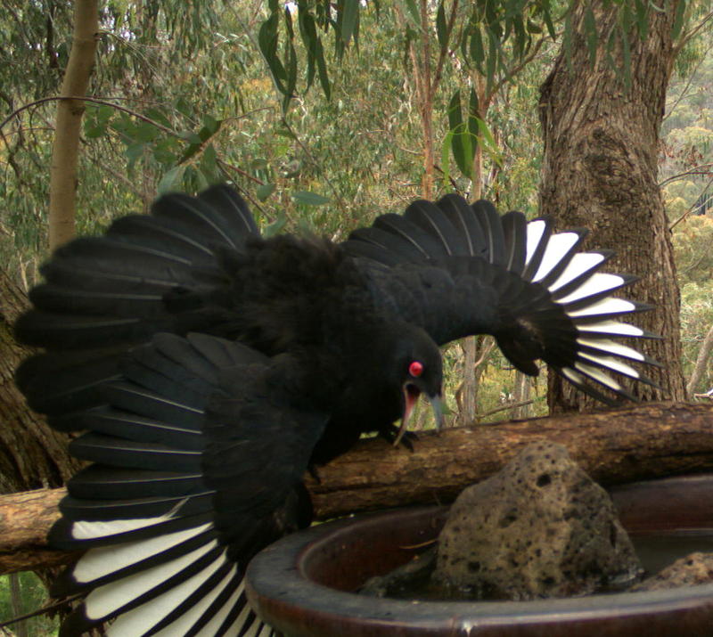 Choughs are ground-foraging birds that live in social groups of up to 20 individuals. Their diet mainly consists of seeds and invertebrates such as termites and beetles. At rest choughs are essentially black. The reason for the white-winged descriptor is obvious when the bird is flying or landing (see picture right). Choughs often get mistaken for the larger raven or currawong. Unmistakeable though are the red eyes of the adult which bulge when the bird is excited.