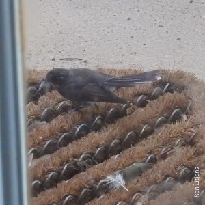 So it was with great delight before Xmas that I heard and then saw two Grey Fantails (Rhipidura albiscapa) involved in a lot of activity in the vines next to the house. The birds then started making repeated trips to the back door (pictured above left through an embarrassingly dirty window) where they appeared to be collecting the hairs of our Border Collie, Mac, from the door mat. The frequency of those visits suggested that the nest was not too far away and after careful observation of the to’s and fro’s of the birds the location of the nest site was soon apparent.