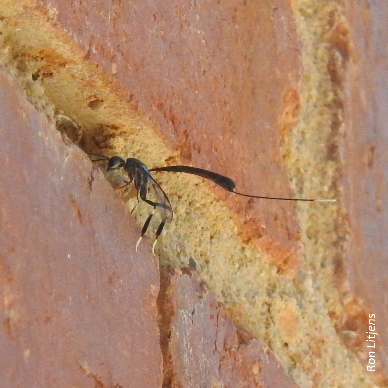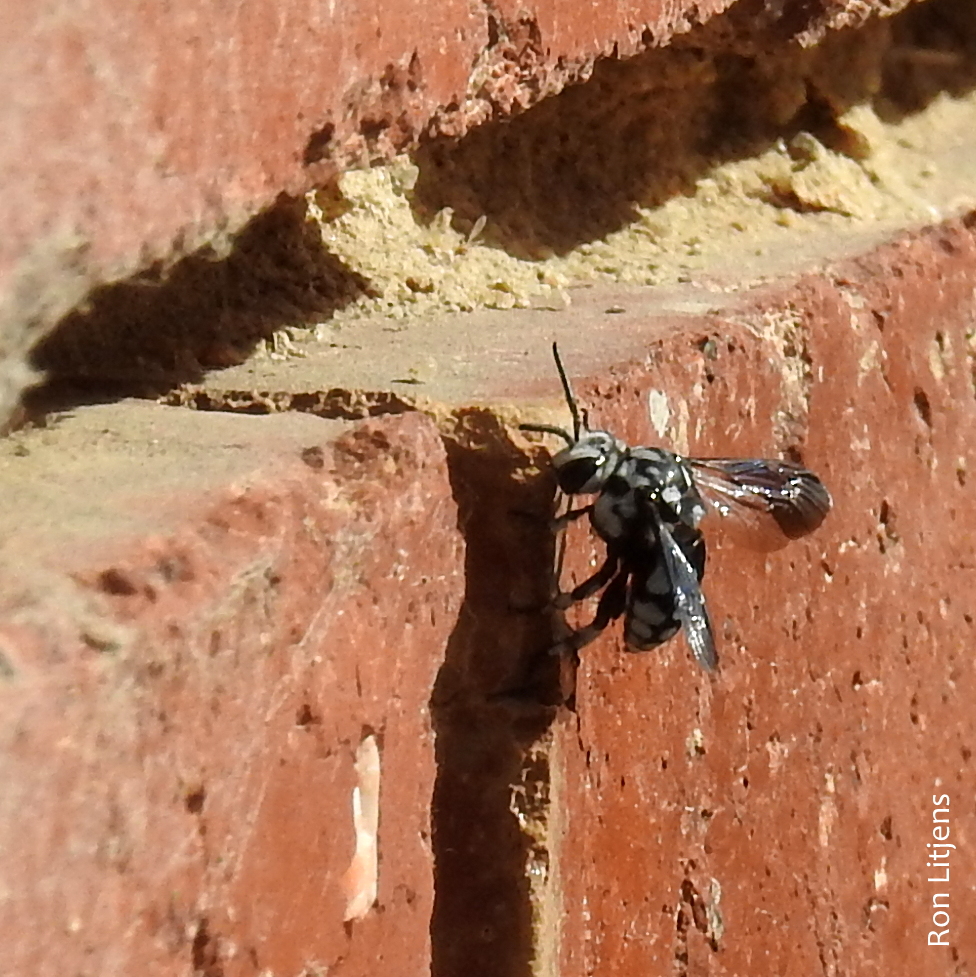 Black Spider Wasps (Fabriogenia sp.), pictured above left, have been searching all the nooks and crannies in the mortar to locate spiders which they detect by tapping their orange antennae on the surface. Once located the wasp immobilises the spider and takes it away to the nest where it lays eggs on it (see previous blog).