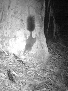 Chris Cobern, coordinator with the Upper Goulburn Landcare Network, is one of a number of volunteers with AQC and reports that they have found scats in the Wallaby Creek area that have been positively identified as containing grooming hairs of a Spotted-tailed Quoll by ecologist (and scat analyser) Barbara Triggs, author of Tracks, Scats and Other Traces – A Field Guide to Australian Mammals. Remote camera deployment is also being used as part of the Victorian Quoll Project, and a yet to be confirmed photo of a quoll was recently recorded. In the Kinglake area Chris has obtained photos of the related Brush-tailed Phascogale (at right), but as yet no quolls.