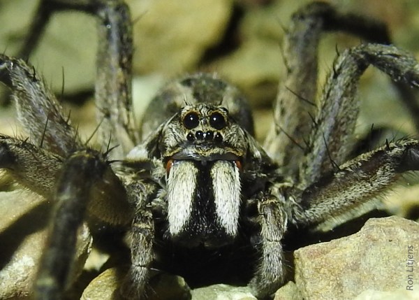 of the family Lycosidae, the Wolf Spiders. Three pairs of eyes can clearly be seen on the front of the cephalothorax (the fused head and thorax section of spiders). The fourth pair of eyes hinted at in the id chart can easily be seen in the picture right, facing backwards. Wolf Spiders are excellent hunters. They have excellent eyesight and have many sensory hairs (see picture above) to enhance the sense of touch. These spiders do not build webs but rely on chasing down prey or ambushing them from their burrows.