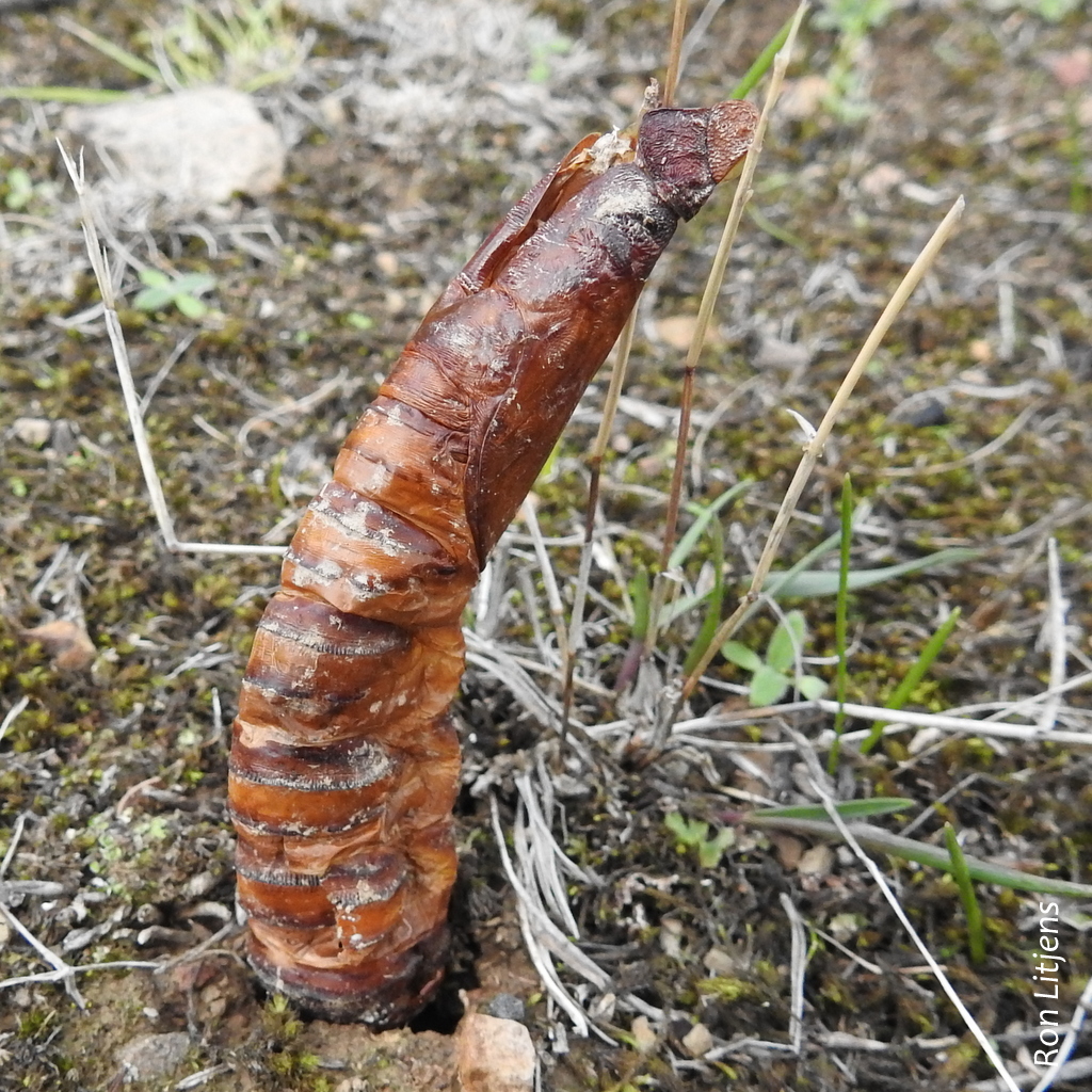 The male moth is smaller than the female. After mating the female moth spreads eggs over a wide area by distributing them whilst in flight. The resultant larvae build burrows in the ground which they line with silk. They then feed on leaf litter or tree roots. The moths pupate in their burrow and when ready the pupa wriggles to the surface and the adult emerges. The empty pupa skin is often found lying on the ground or still poking out of the burrow (see picture right).