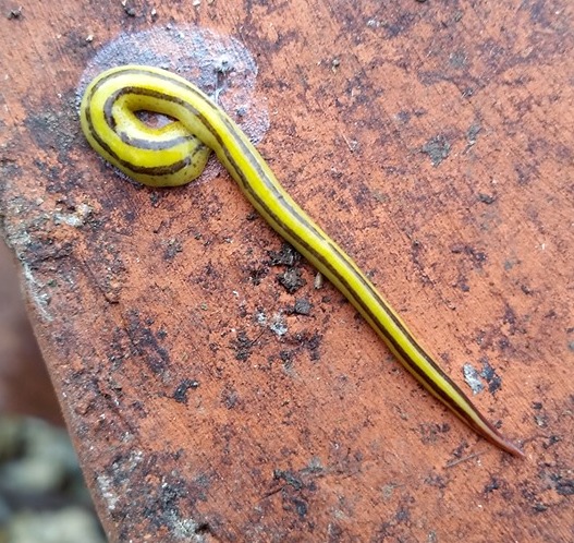 Tina is the local creative artist, flower arranger extraordinaire and style icon for vintage clothes. She works in the local garden supplies centre and as such frequently comes across weird and wonderful fauna amongst the pots and plants. The latest is this beauty (pictured below). On first appearances it looks like a candy-cane coloured slug. It is in fact a flatworm, a Howitt’s Flatworm (Artioposthia howitti) to be exact.