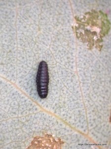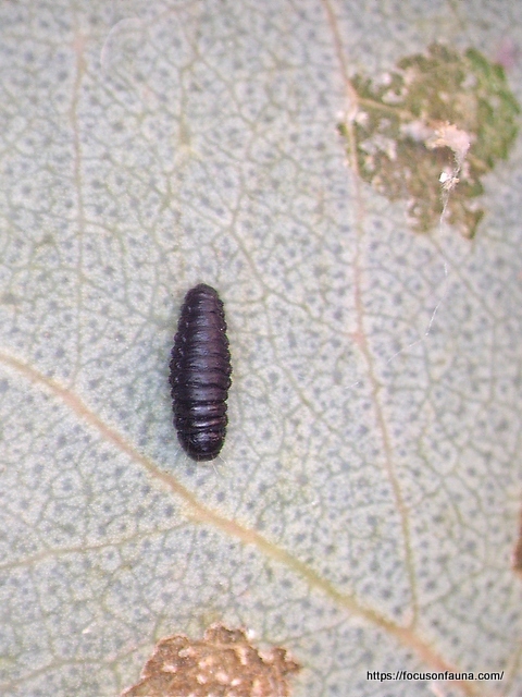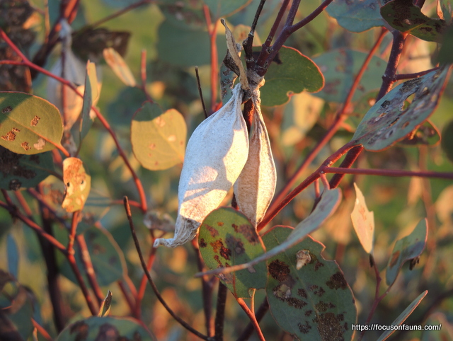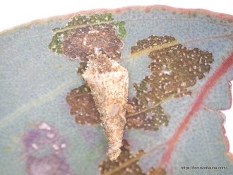 Actually most of the sacs seemed to be old and inactive – one we dissected had only a dry pupa case inside, the moth having flown the coop. On closer inspection of the leaves, we noticed there were numerous much smaller cases (less than 1cm long), and these contained tiny dark larvae actively chewing and moving around, which were clearly responsible for much of the leaf damage.