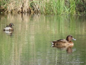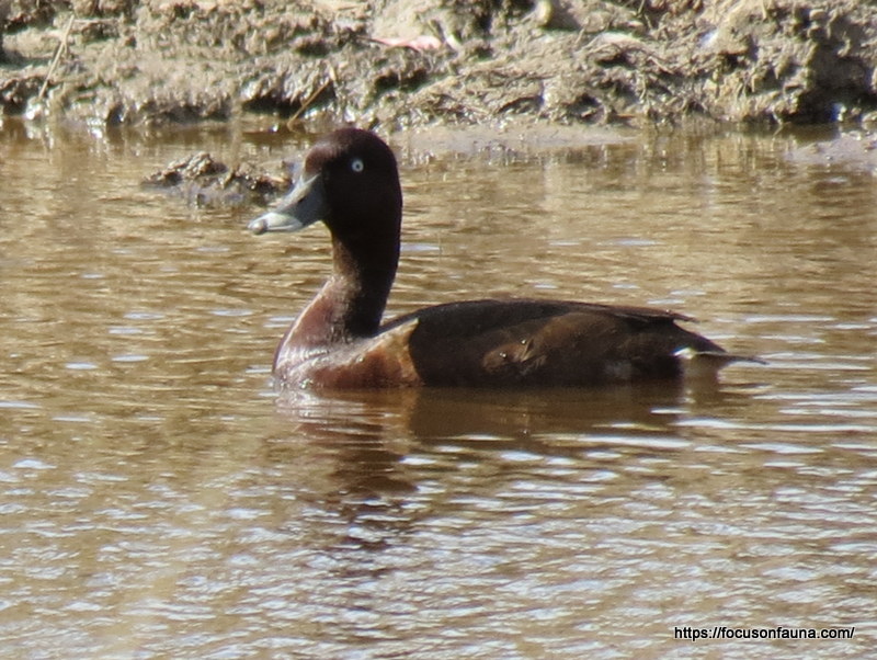 The male Hardhead has a conspicuous white eye (see photo below), which gave rise to its previous name, White-eyed Duck. The “Hardhead” monicker was apparently given to it by shooters who considered it hard to kill due to its dense plumage and reputed stamina (from Australian Bird Names, Fraser & Gray).