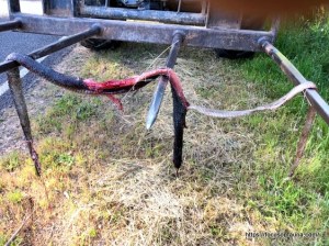 A grisly and sad sight confronted local farmer Terry while out on his tractor on the Broadford-Flowerdale Road. A Red-bellied Black Snake (Pseudechis porphyriacus) had been run over by a vehicle and the impact had dislodged its stomach content – an Eastern Brown Snake (Pseudonaja textilis). The brown snake was about 3/4 the length of the very fat black which was estimated at just under 1.5 metres long.