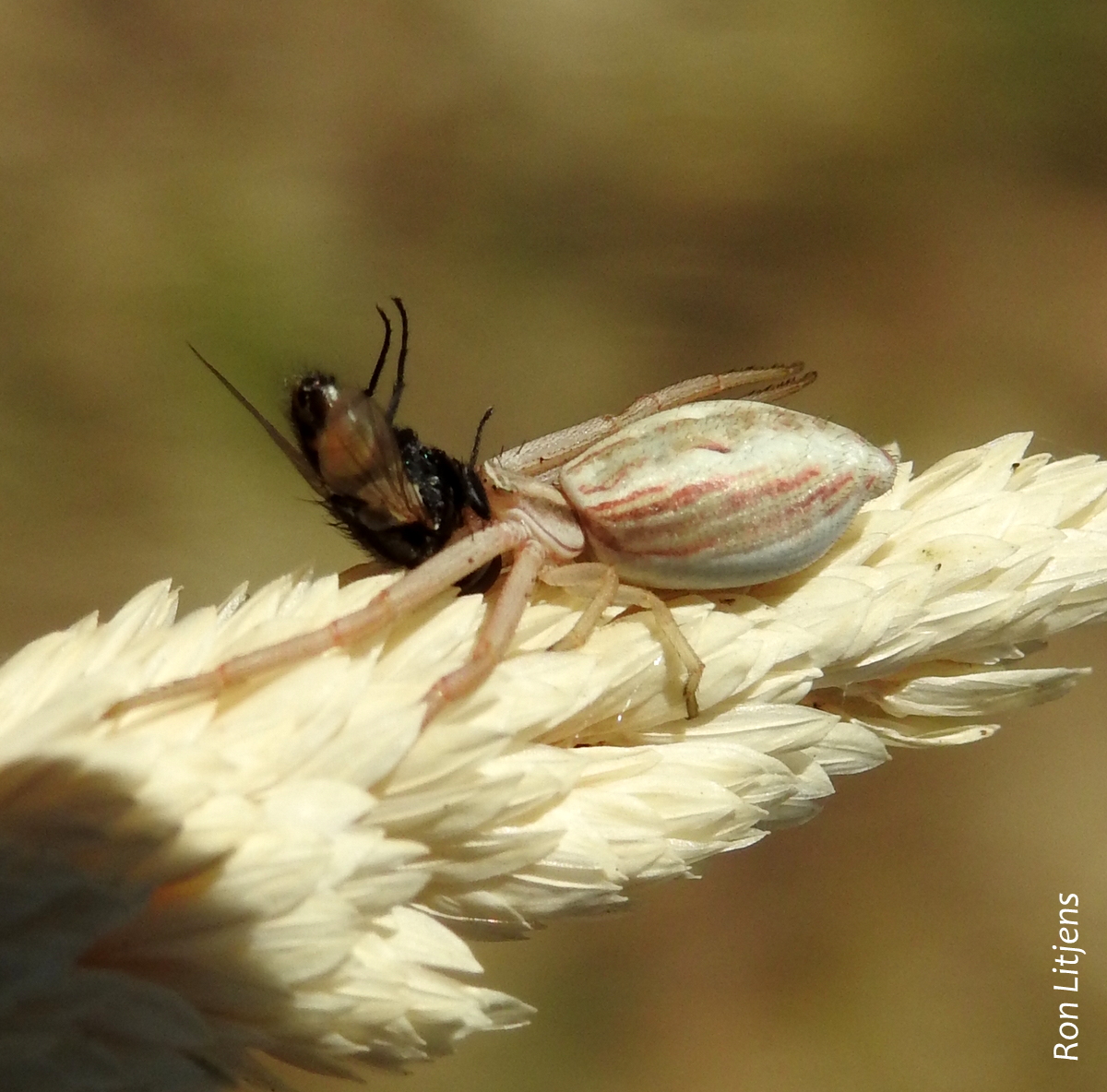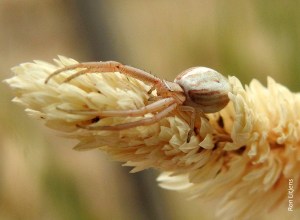 What this spider knows is that in the early morning the phalaris seed heads are a favourite place for flies to land to warm themselves in the rising sun. The seed heads are covered in flies and with patience it is just a matter of time before a fly lands within reach of the spider’s grasp.
