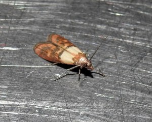 Well this week the responsible critter revealed itself. Opening the walnut container released a squadron of Indianmeal Moths (Plodia interpunctella), pictured below, into the kitchen. The insects are named not for their country of origin but for the fact the larvae feed on cornmeal (Indian meal). They also feed on nuts (obviously), cereal, pasta, bread, flour, even dogfood.