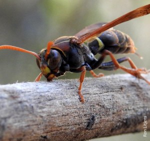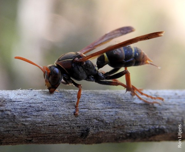 On Xmas arvo Mac and I were sitting at the dam in Flowerdale – well Mac was laying in the dam and I was sitting on the slope watching. I noticed a wasp struggling on the surface of the water. Normally I would let nature take this course but I made a deal with the wasp that if I fished it out, it would sit still long enough for me to get a good photograph, something I find difficult to do with wasps. I don’t know whether it heard but it took a considerable amount of time de-watering itself before flying off, enough time for me to get a photo or two. It was a Common Paper Wasp (Polistes humilis), pictured left and below, which has been described in a previous blog.