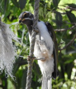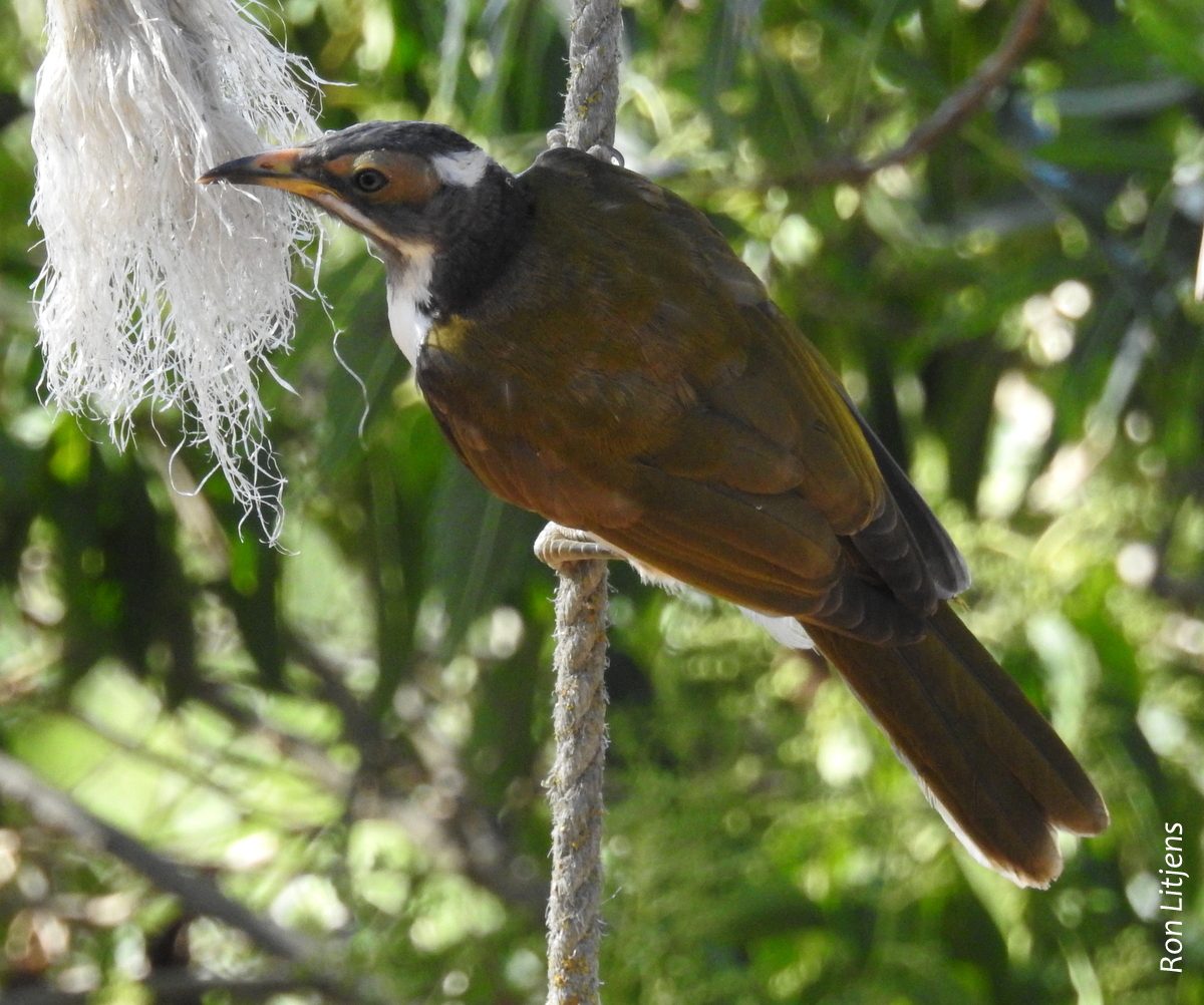 Whilst weeding the vegie patch I heard a bird call unusual for this area and looking up there was a juvenile Blue-faced Honeyeater in the tree above, pictured right and below. The green patch around its eye is bare skin and is indicative of the age of the bird. Young birds have yellow skin around the eye which turns green after six months. This skin turns blue after about 16 months.