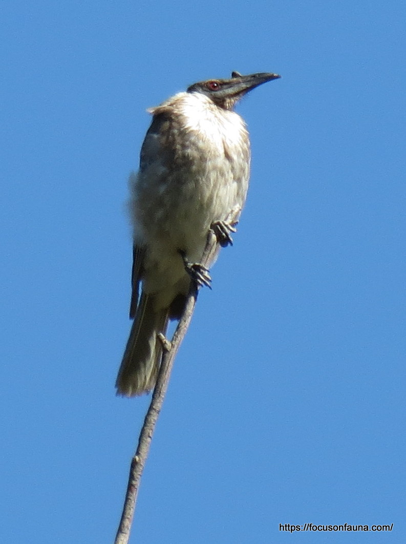 We were surprised to hear the burbling call of a Noisy Friarbird at our place the other day. We then spotted a lone bird perched high in a dead tree, which didn’t make for great photography, especially as it only stayed for a very short time. The friarbird is an uncommon visitor to this district – we have only recorded it here eight times in the last twenty years, always from October to April since it is mostly migratory in the southern part of its range, heading north as far as central Queensland for winter.