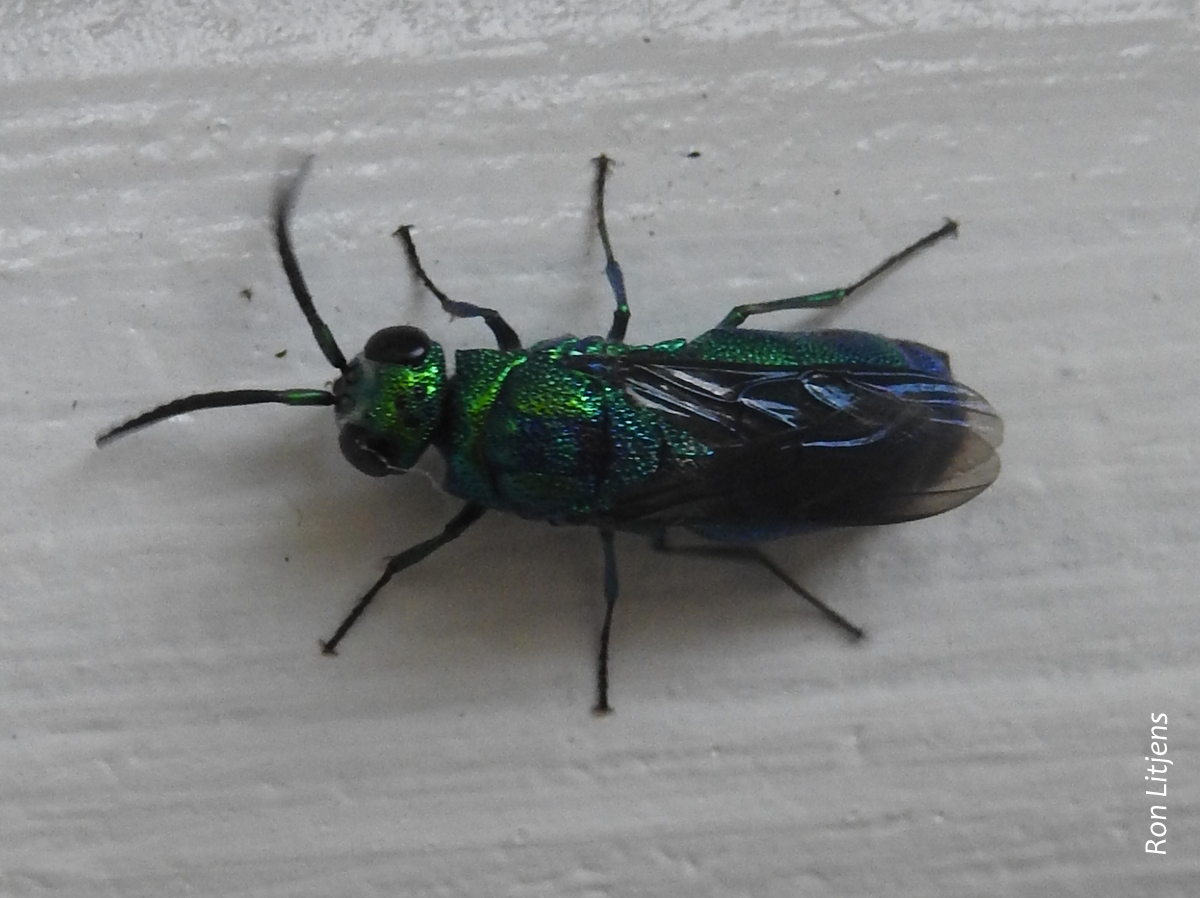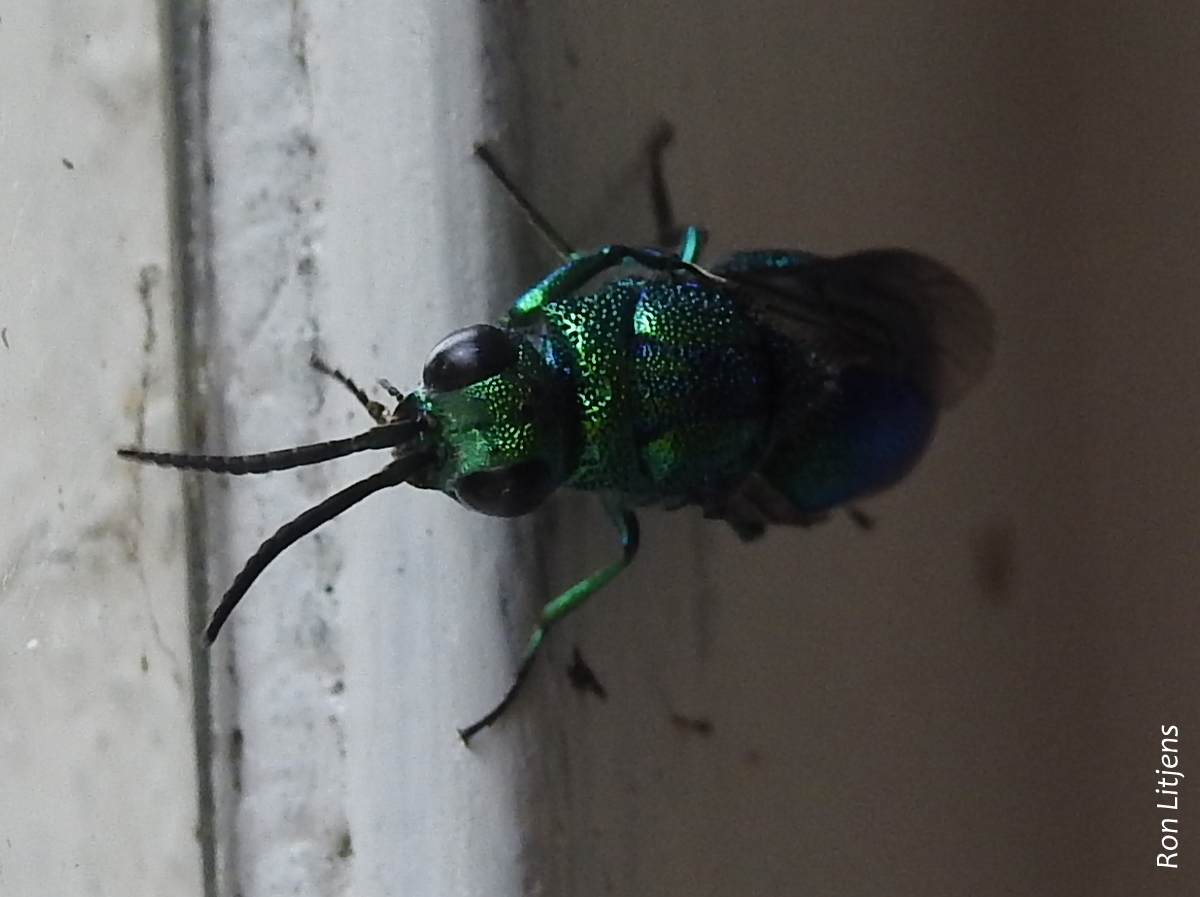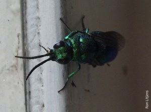 Cuckoo Wasps are named because the process by which they rear their young uses the same principle employed by Cuckoos, laying eggs in the nest of another species. Cuckoo Wasps are parasitoid meaning they are parasitic but the end point is the death of the host. Furthermore they are klepto-parasitoid (from the Greek word kleptein meaning to steal). They steal both nests and the food provisions from other wasps.