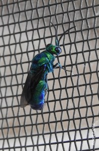 Arguably some of the most beautiful insects in Australia are the Cuckoo Wasps (pictured). Sometimes called Jewel Wasps the colours are due to the way their multi-layered and pitted exoskeletons interact with light – the same as for Stag Beetles. They are a frequent visitor to the Blue-banded B&B. I found to my surprise that they are not at all interested in the Blue-banded Bees nesting in the structure like many of the other wasp visitors, but rather the Mud Wasps building nests there.