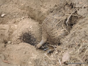 When first discovered the puggle was probably about 4 – 5 months old, and is now almost fully spined and getting ready to leave the nest. In fact a few days ago we watched as the young one appeared and ventured off on its first little jaunt. It’s a bit wobbly on its pins, but a capable digger and very attuned to sounds and smells, immediately becoming a partially buried prickly ball when feeling threatened.