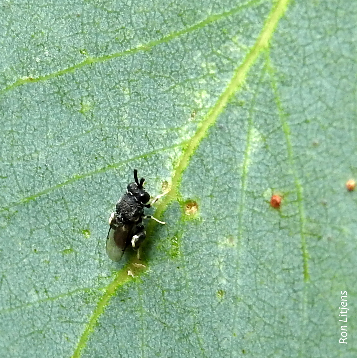 Smaller still was this Chalcid Wasp pictured (right) on a eucalypt leaf. Again the adults are nectar feeders. Most species from this family of wasps are parasitoid – they lay their eggs on a live but paralysed host i.e. they are parasitic but resulting in the host’s death. Some species though are termed hyperparasitoid (now focus) they lay their eggs on the eggs of wasps that lay their eggs on a host. Small in size…large in confusion.