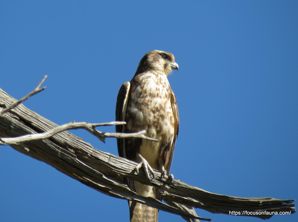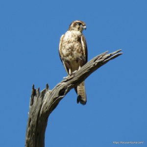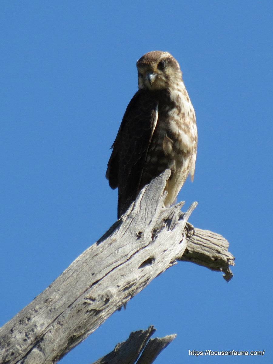 One of the most common and widespread of Australia’s raptors, the Brown Falcon is not always immediately identifiable due to its highly variable plumage, from a uniform dusky dark brown through mostly rufous, to brown above with whitish underparts, like the one pictured. The consistent giveaway for identifying this species is the facial markings, with a dark “tear drop” stripe below its eye and another dark patch on its pale cheek. It also helps to know that this is one of the noisiest raptors, with a characteristic cackling call in flight.
