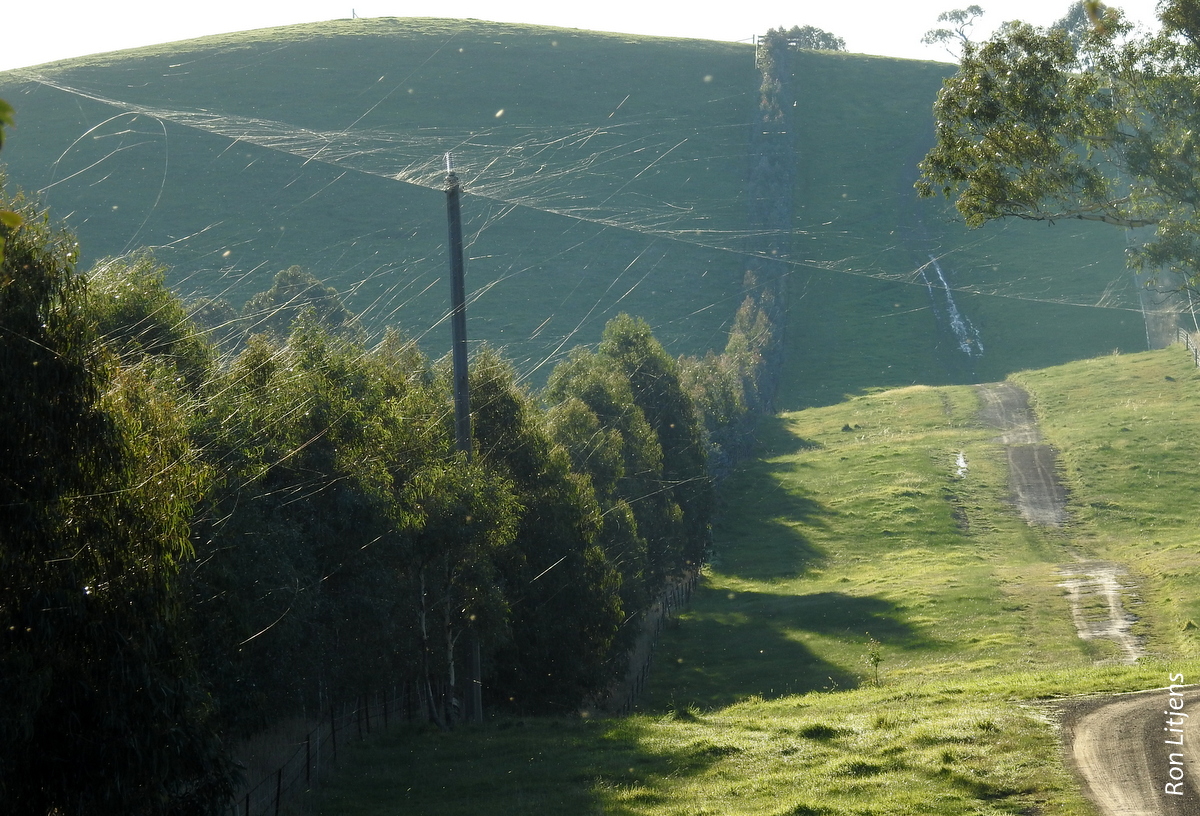 This is probably the first blog since we started in 2011 that has not featured a photo of a critter. But you can certainly see where they have been. If you have been cycling or walking recently you would have felt it. Or if you have been driving when the sun is just at the right (correct) angle you maybe would have seen it – silk streamers festooned on everything. Not just one or two but thousands, dare I say millions of them (pictured left). One of the sources of this phenomenon is spiders.  A previous blog (Keeping the wolves from your door) featured Wolf Spiders and mentioned that the young spiderlings disperse by releasing a strand of silk into the breeze and ‘ballooning’ away. Now is that time.