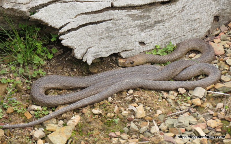 We are lucky enough to be living in Strath Creek during this pandemic so that when there is a break in the weather we can get outside to do some much-needed weeding in the garden. In the warmer months we keep a watchful eye out for wildlife, but in winter we tend not to be as aware, so that when one of the intrepid weeders took the next step to the left, it was a bit of surprise to see what was nearly underfoot – an Eastern (or Common) Brown Snake (Pseudonaja textilis), pictured below.
