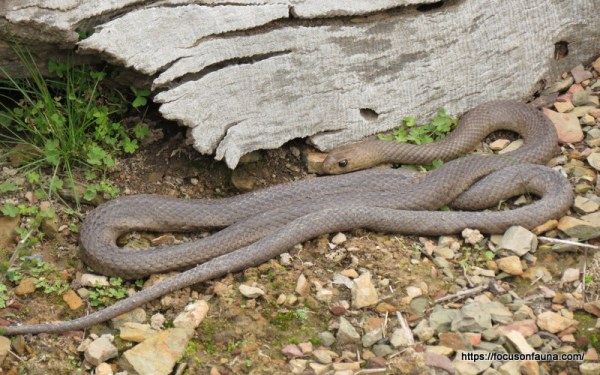 We took our camera out a day or so later to see if the snake was there again, and fortunately it was. By our reckoning it was probably about 1.4m long, although quite skinny. Usually you only see a brown snake as it heads away from you at lightning speed, but this one was much more relaxed, or sluggish, the temperature being a cool 14°C. Waiting conveniently until we had taken our photos, it slid ever so gently under the log where it seems to be living.