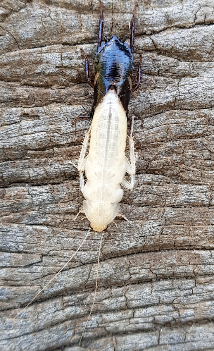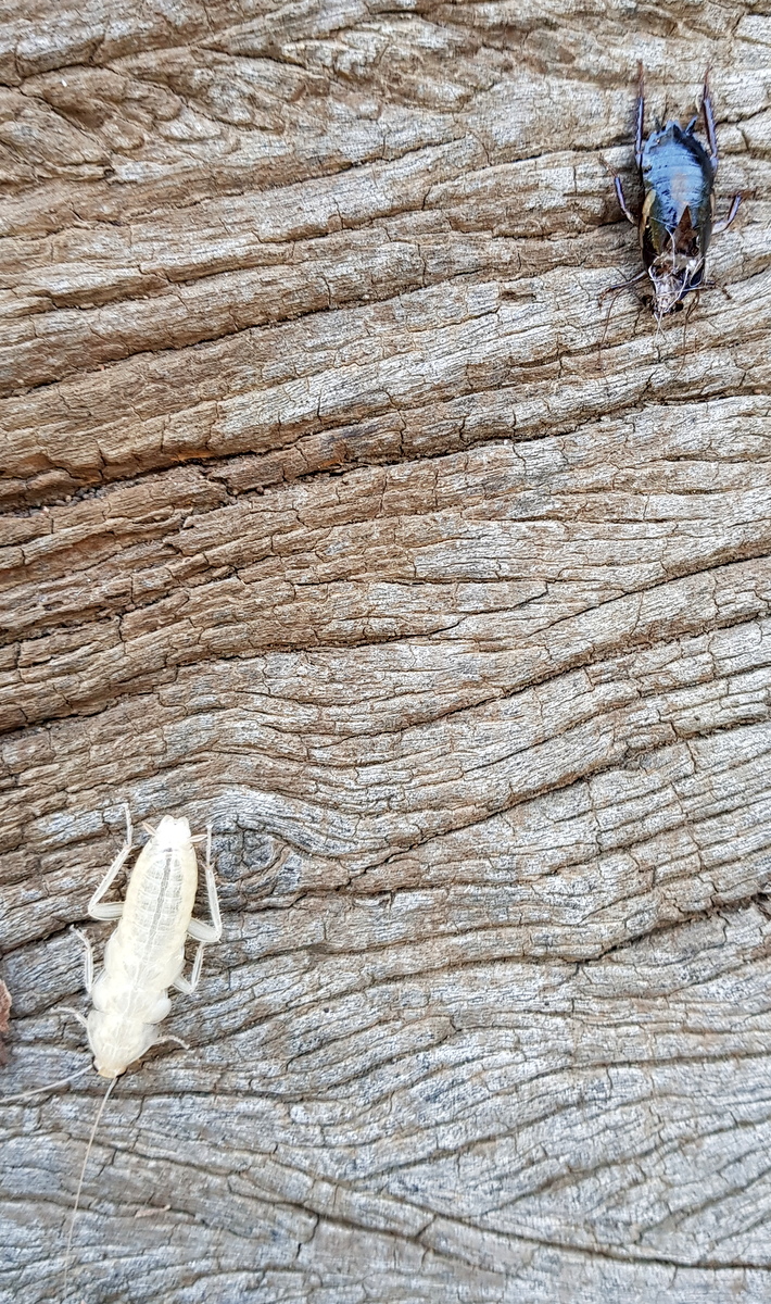 Cockroaches also develop by this pathway. Cat photographed a cockroach moulting in her wood shed. The emerging insect can be seen backing out of its old skin that is left containing all the features of the recently departed insect including the antennae. The new exoskeleton is initially soft but hardens when exposed to air. From the photo it is hard to tell if the emerged cockroach is the adult or one of the instars (a term used to describe a nymph during the lifecycle e.g. 1st instar, 2nd instar, etc).