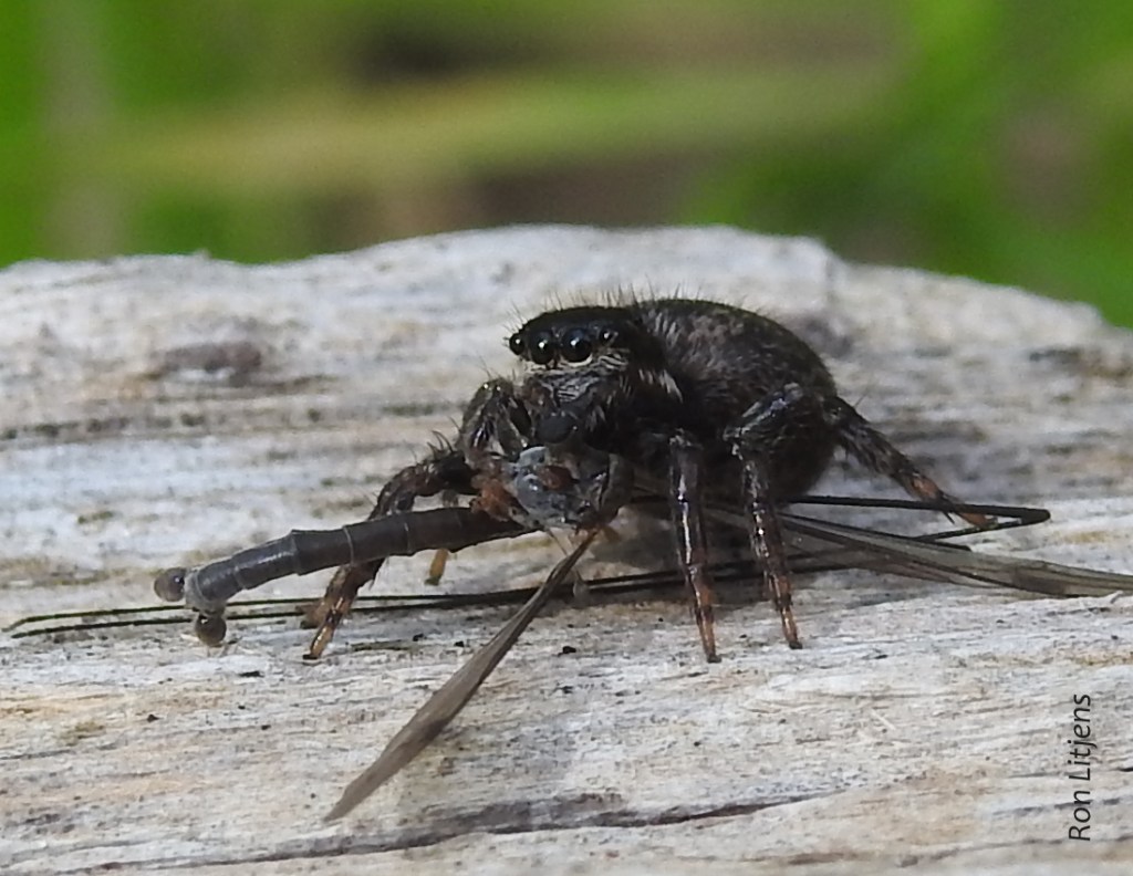 For a start their long legs mean that Crane Flies are often mistaken for mosquitos and being a slow flyer many cranefly/human interactions often do not end well (for the Crane Fly). But nature also throws up a number of other hazards. Crane flies are the prey of fish, birds, mammals and other insects. Spiders are also natural predators, not only those that build webs but also Jumping Spiders (pictured below) that have the ability to leap out and ambush the unwary.