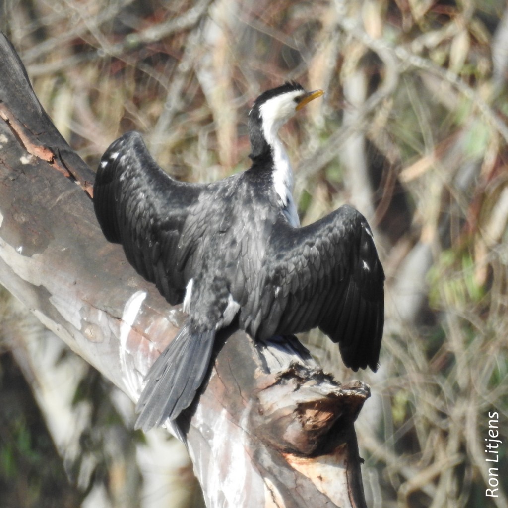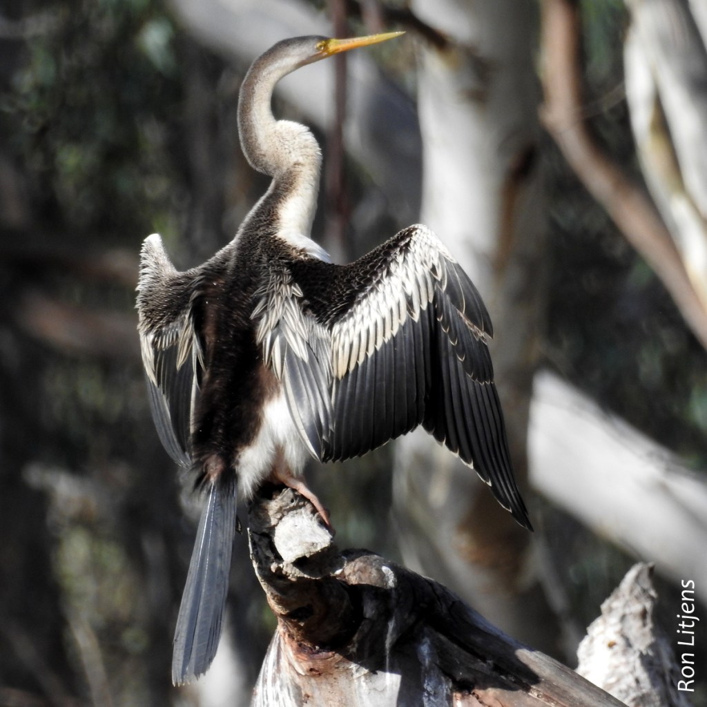 Birds such as Australasian Darters (Anhinga novaehollandiae), pictured left, and Little Pied Cormorants (Microcarbo melanoleucos), pictured below right, can often be seen standing with their wings outstretched drying them in the sun. The assumption many people make is that they lack the ‘preening’ gland at the base of the tail that produces an oil type substance used by waterbirds to waterproof their wings. Darters and cormorants do indeed have the gland. The birds use their heads and beaks to spread the oil through the feathers. There is some debate as to whether the oil actually produces the waterproofing or if the feather structure itself does the job and the oil just keeps the feathers in good condition.