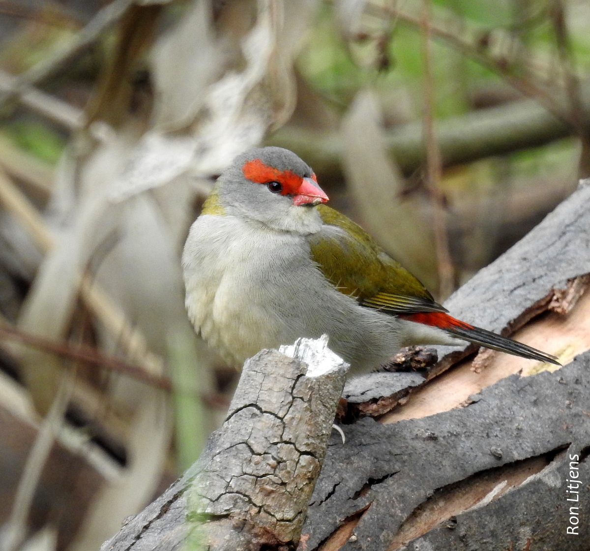 Red-browed Finches (Neochmia temporalis) are small birds easily recognisable by the red streak above the eye and the bright red rump displayed when flying. The scientific name meaning ‘new bird with temples’ is derived from the Greek words ‘neokhmos’ meaning new and ‘temporalis’ meaning to do with the temples i.e. forehead.