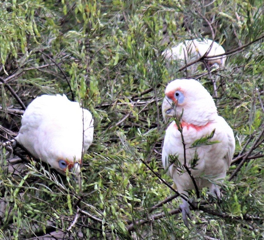 That was not my experience. I had only been in the area a short time and I thought the two species were equally common. I have photos of both in the same tree. The Little Corella (Cacatua sanguinea), pictured left, has a crest and no visible red on its front. The Long-billed Corella (C. tenuirostris), pictured below, has a less-noticeable crest, a long upper mandible for a beak and looks like its throat has been cut with a red gash easily visible when it is perched. The calls are different, too. The Little corella always sounds sad, a plaintive one-note call; the Long-billed has a quavering curr-ur-rup. Both can be deafening when flocks go past.