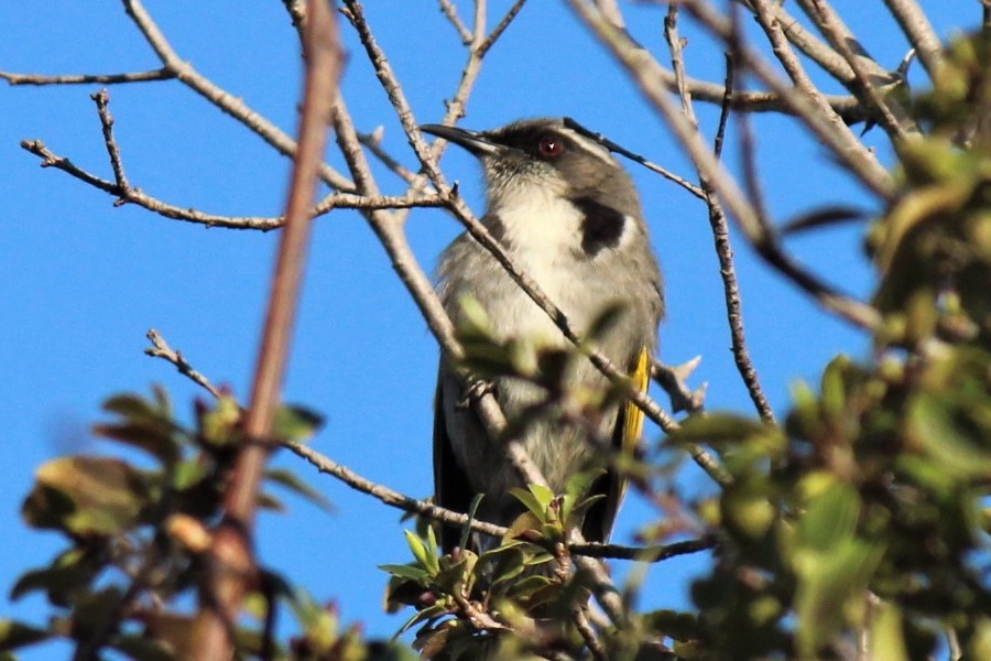 Twice now I have detected this new bird in my backyard, giving an animated and loud vocal display. It is a Crescent Honeyeater (Phylidonyris pyrrhopterus). Maree found them on Junction Hill in this post in 2019. Never recorded in Yea before. The first time in late August, it attracted the local bullyboys and was driven out by two Red Wattlebirds with cheering on by some spinebills and fairywrens. Today it was back unimpeded, calling loudly on a cold sunny morning from the top of a bush. Both times it has been a single male bird (the female has more muted colours all round).